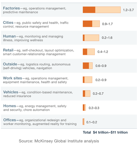 At the same time, McKinsey analyzed over 150 use cases to establish the potential benefits and challenges associated with IoT for the global economy. The use cases included everything from manufacturers of devices to monitor health and wellness to businesses that use sensors to optimize equipment maintenance and safety of workers. What McKinsey found was that with 36% percent of North American companies already having IoT initiatives in 2015, the potential economic impact of IoT by 2025 could be as much as $3.9-$11.1 trillion, annually.