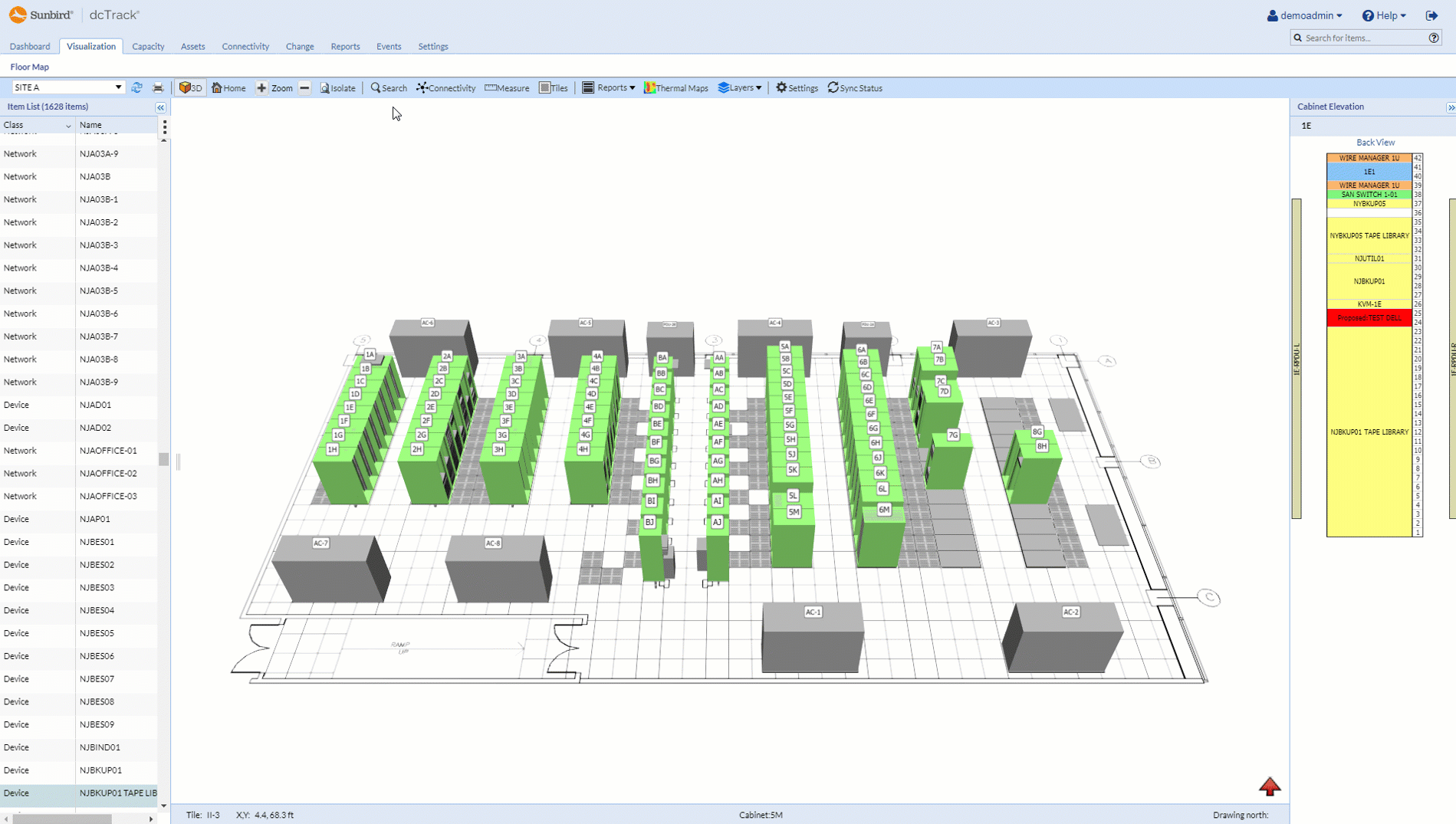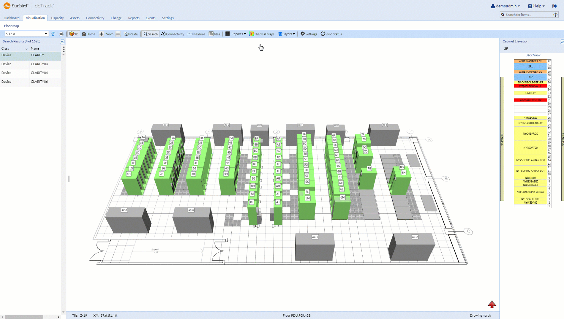 Multi-field search is available on the floor map, enabling you to quickly locate items in your data center.