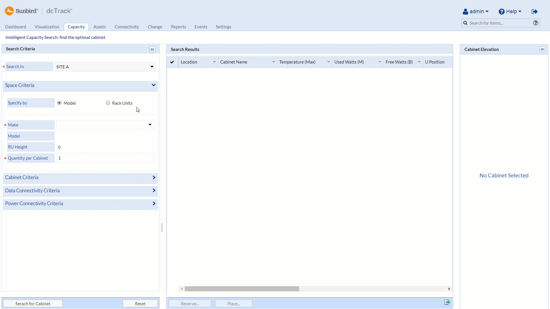 For example, when using dcTrack Intelligent Capacity Search feature to find and reserve the optimal space, power, and network port capacity for your assets, you can apply a Planned Decomm. Date to include assets, even if you haven’t yet decommissioned them. You can also add multiples quantities of the same asset per cabinet and apply a project number for faster, more efficient capacity planning.